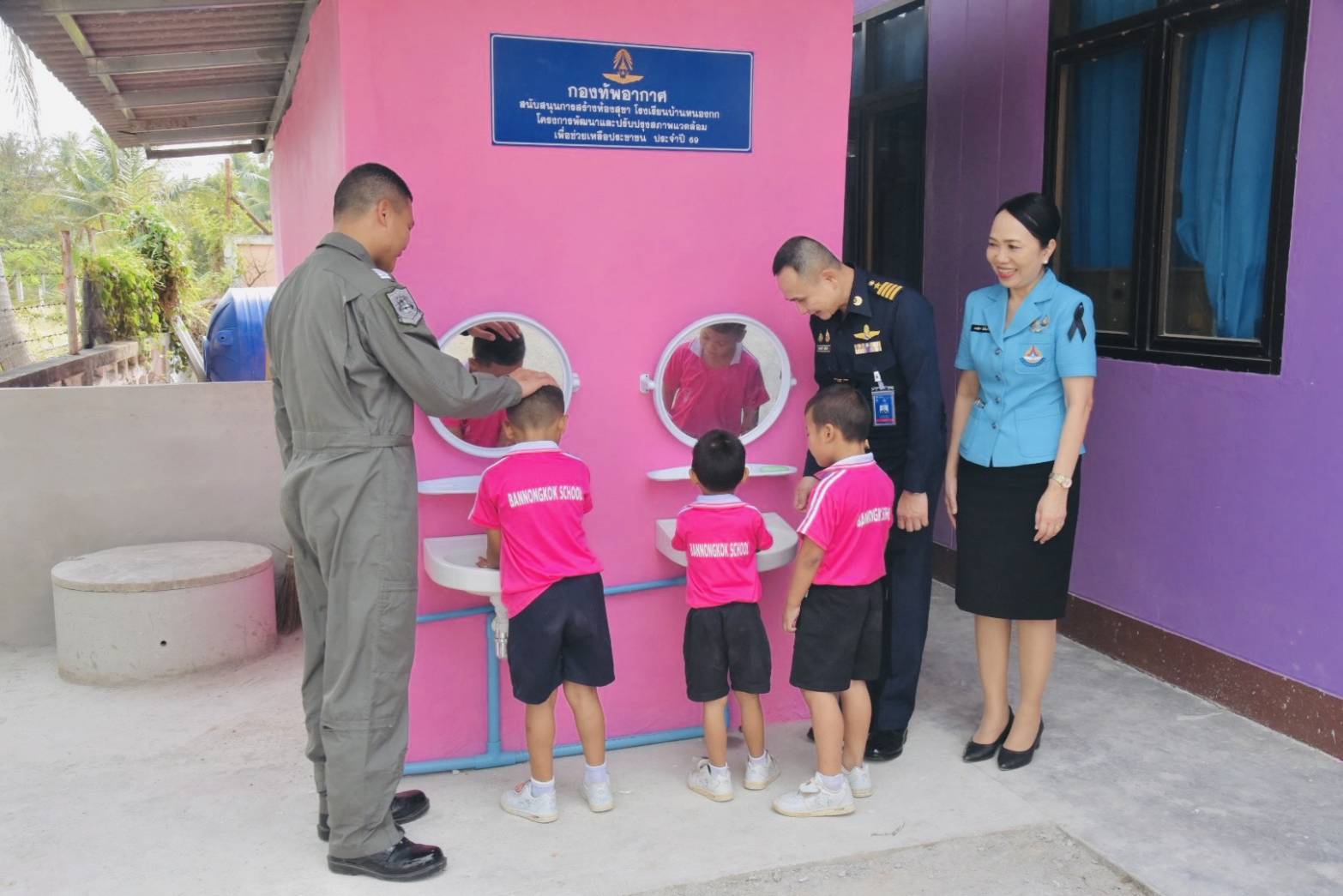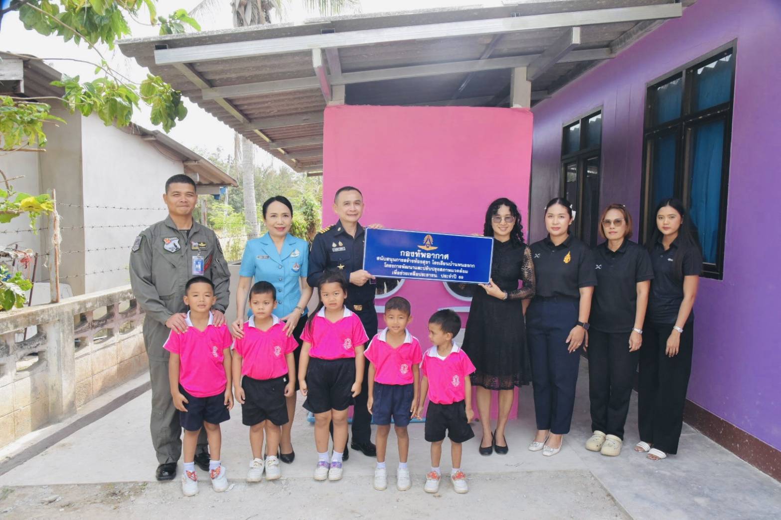 นาวาอากาศเอก รัตนศักดิ์ โพธิ์แก้ว ผู้บังคับการกองบิน ๕ พร้อมด้วย ดร.กรรณิกา โพธิ์แก้ว ประธานชมรมคู่สมรสทหารอากาศกองบิน ๕ และนาวาอากาศเอก สุทธิวัฒน์ บุญชู เสนาธิการกองบิน ๕ ร่วมส่งมอบโครงการพัฒนาและปรับปรุงสภาพแวดล้อม เพื่อช่วยเหลือประชาชน ประจำปี ๒๕๖๙ ให้แก่โรงเรียนบ้านหนองกก