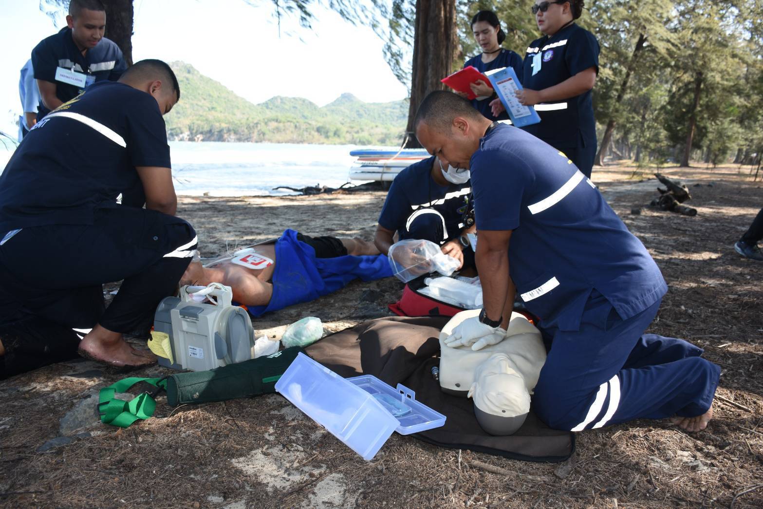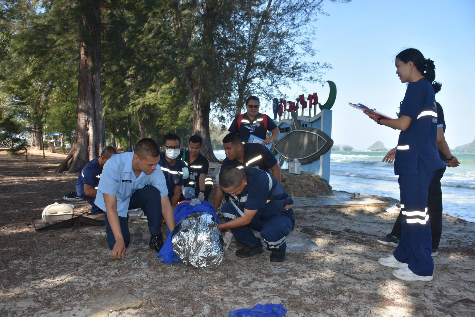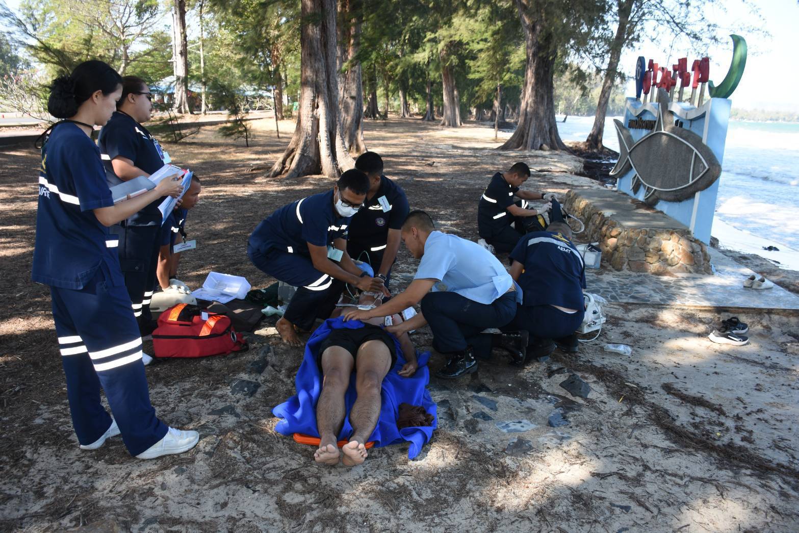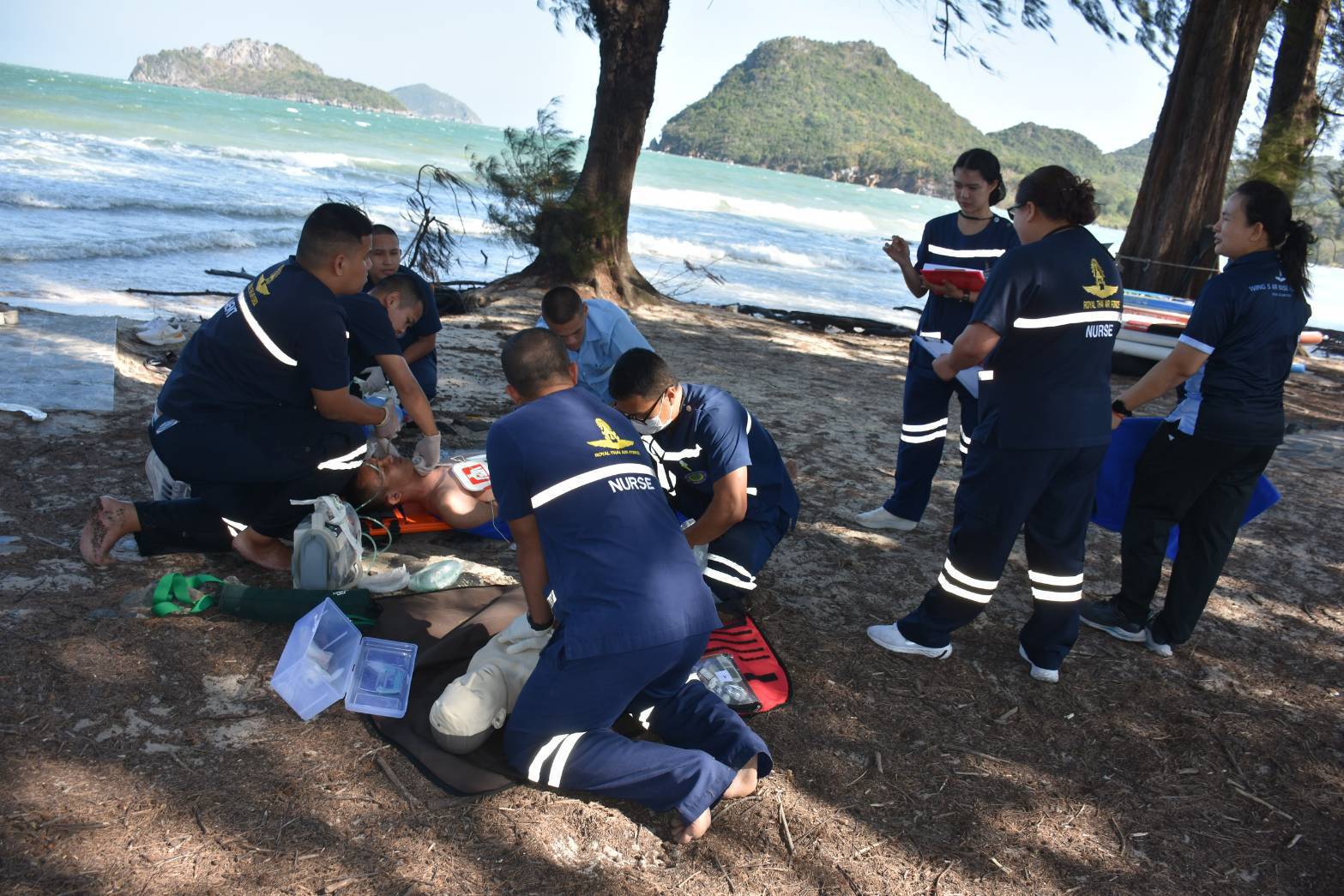 นาวาอากาศเอก รัตนศักดิ์ โพธิ์แก้ว ผู้บังคับการกองบิน ๕ มอบหมายให้โรงพยาบาลกองบิน ๕ ดำเนินการฝึกซ้อมการปฐมพยาบาลเบื้องต้นและการช่วยชีวิตขั้นพื้นฐาน (CPR) รวมถึงการใช้เครื่องกระตุกไฟฟ้าหัวใจอัตโนมัติ (AED) กรณีเกิดเหตุฉุกเฉินกับนักท่องเที่ยวที่หมดสติหรือจมน้ำ โดยมีการฝึกปฏิบัติจริงเพื่อเสริมสร้างความรู้ ความเข้าใจ และความมั่นใจในการให้ความช่วยเหลือในสถานการณ์เร่งด่วน ก่อนที่ทีมบุคลากรทางการแพทย์จะมาถึง หรือก่อนส่งต่อผู้ป่วยไปยังสถานพยาบาลใกล้เคียง