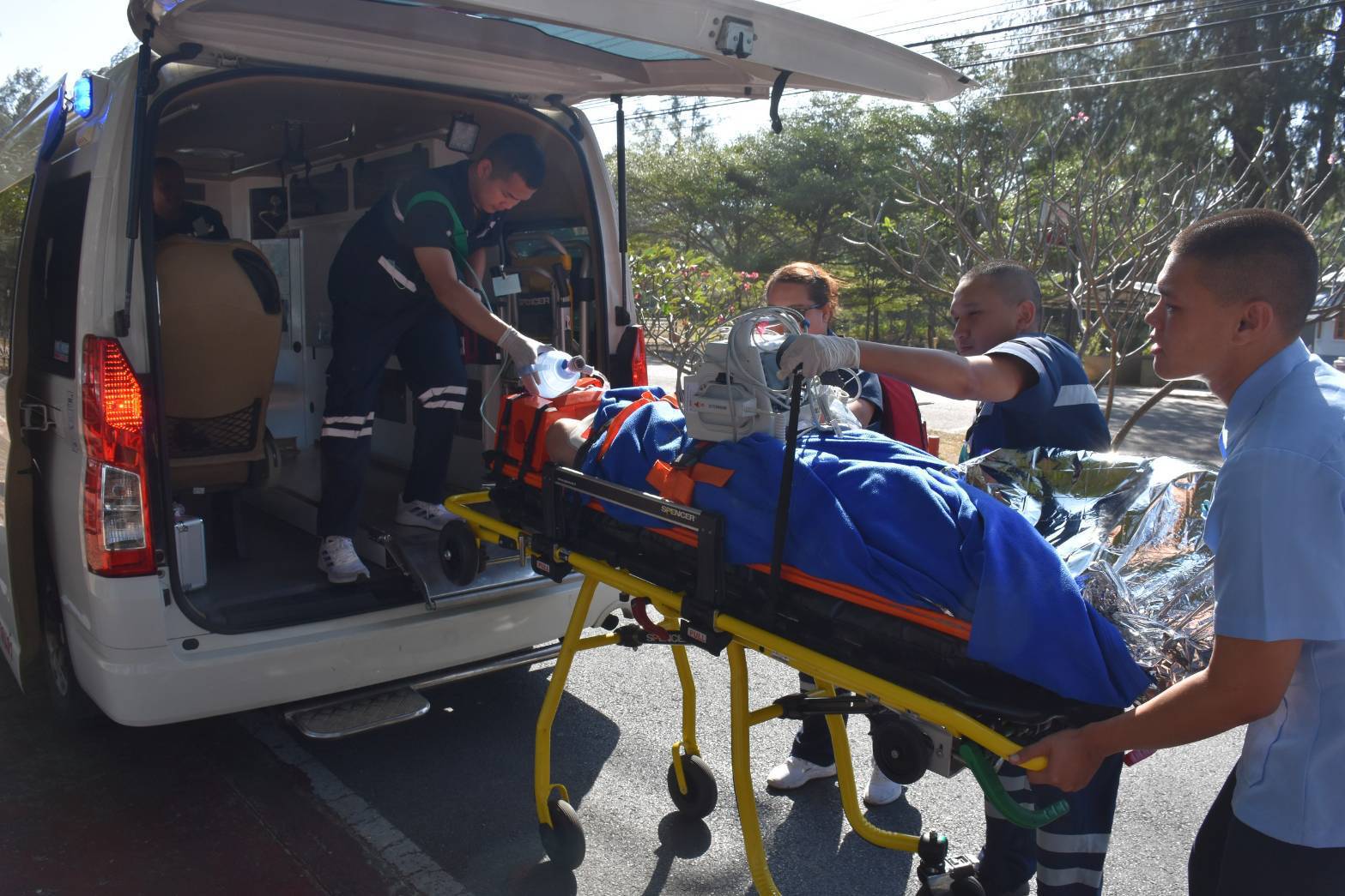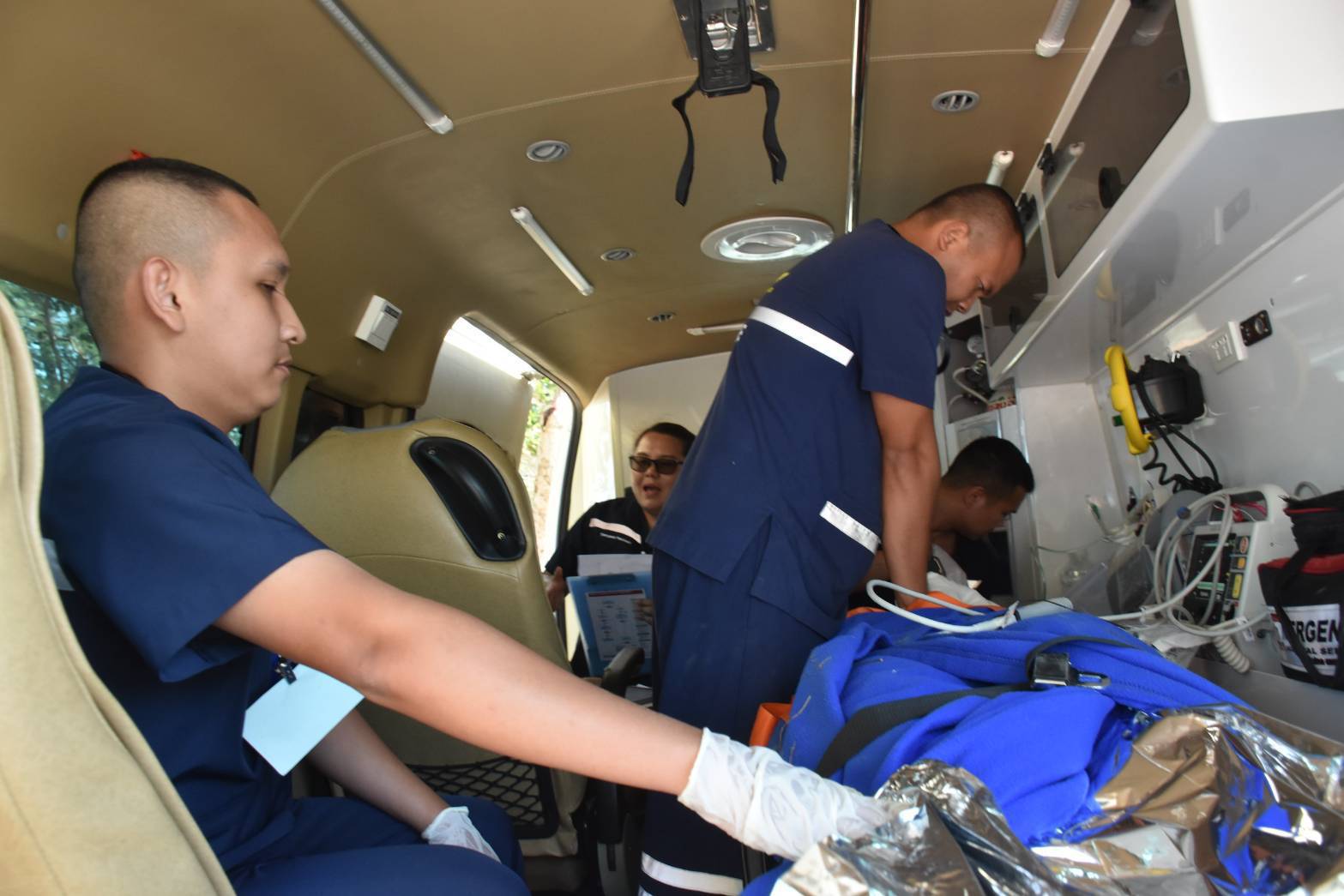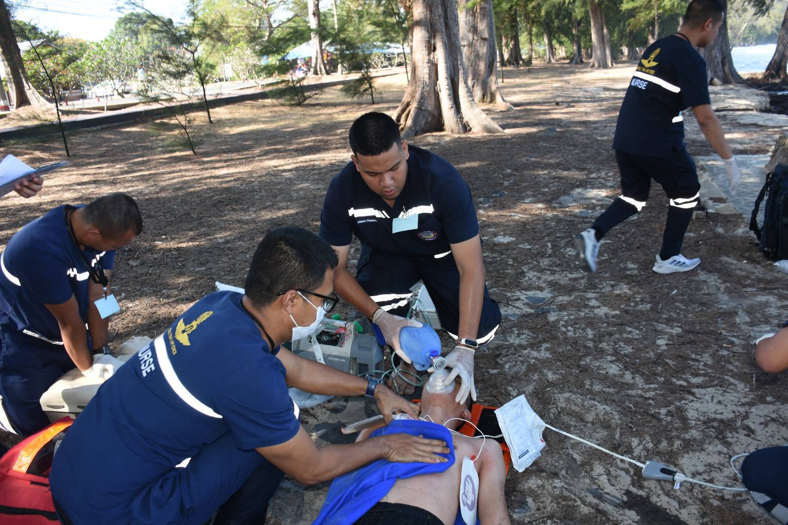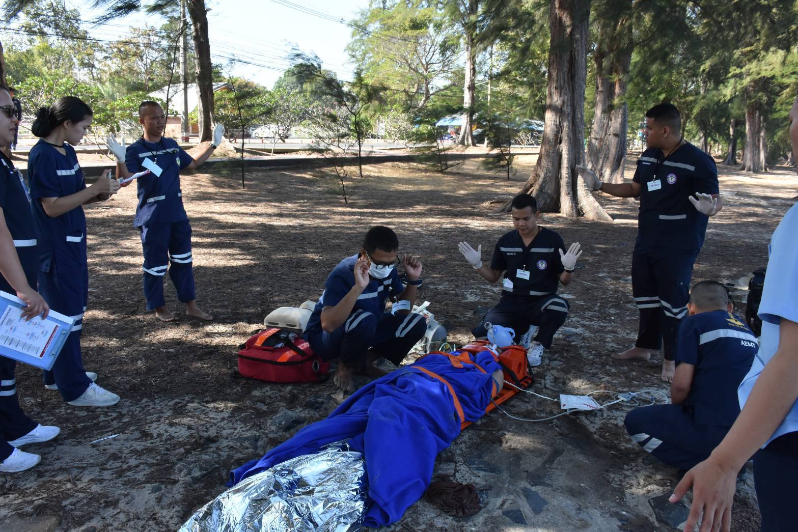 นาวาอากาศเอก รัตนศักดิ์ โพธิ์แก้ว ผู้บังคับการกองบิน ๕ มอบหมายให้โรงพยาบาลกองบิน ๕ ดำเนินการฝึกซ้อมการปฐมพยาบาลเบื้องต้นและการช่วยชีวิตขั้นพื้นฐาน (CPR) รวมถึงการใช้เครื่องกระตุกไฟฟ้าหัวใจอัตโนมัติ (AED) กรณีเกิดเหตุฉุกเฉินกับนักท่องเที่ยวที่หมดสติหรือจมน้ำ โดยมีการฝึกปฏิบัติจริงเพื่อเสริมสร้างความรู้ ความเข้าใจ และความมั่นใจในการให้ความช่วยเหลือในสถานการณ์เร่งด่วน ก่อนที่ทีมบุคลากรทางการแพทย์จะมาถึง หรือก่อนส่งต่อผู้ป่วยไปยังสถานพยาบาลใกล้เคียง