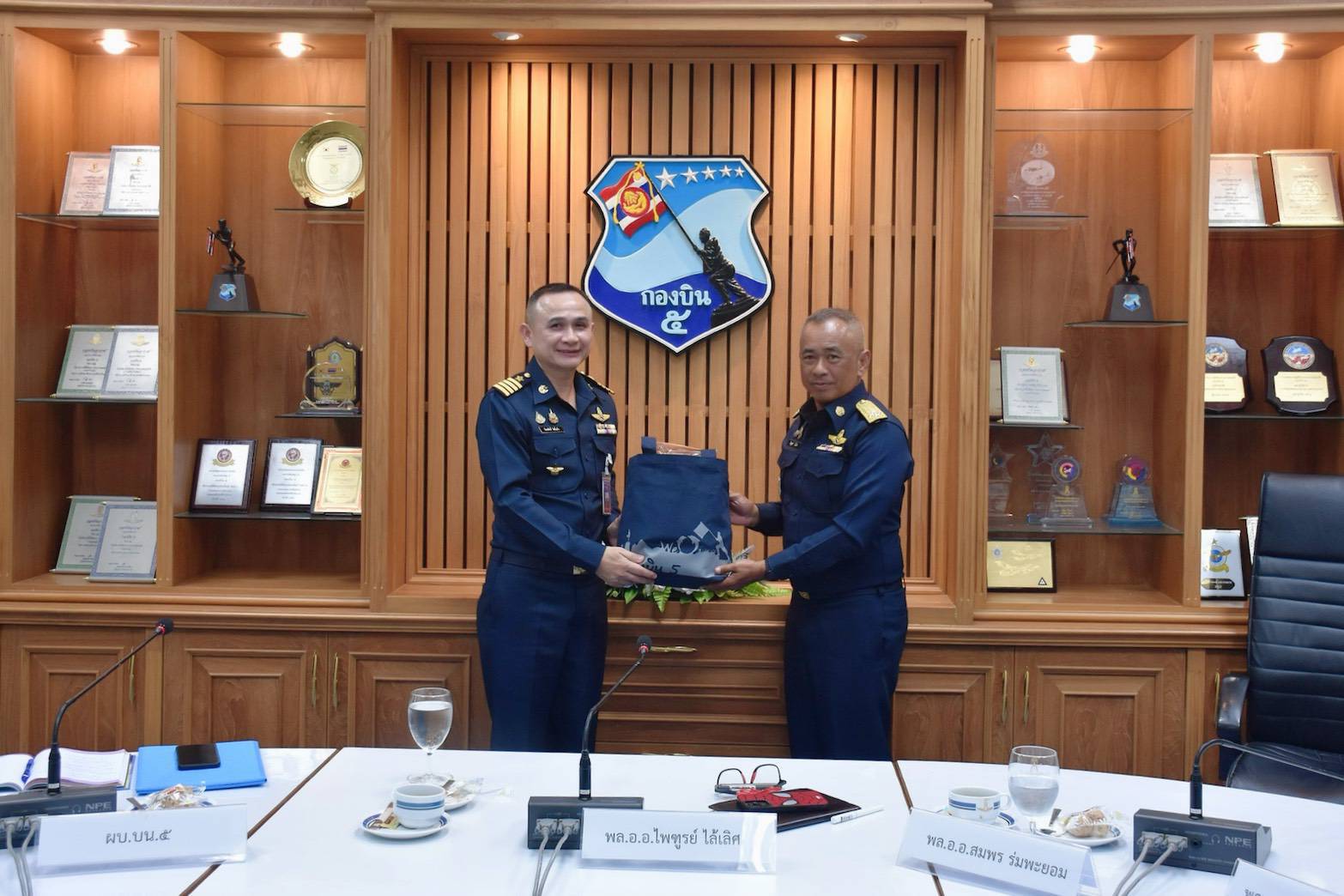 นาวาอากาศเอก รัตนศักดิ์ โพธิ์แก้ว ผู้บังคับการกองบิน ๕ ให้การต้อนรับ พลอากาศเอก ไพฑูรย์ ไล้เลิศ ผู้ทรงคุณวุฒิพิเศษกองทัพอากาศ ในฐานะประธานคณะกรรมการสิ่งแวดล้อมกองทัพอากาศ พร้อมคณะ ในโอกาสเดินทางมาตรวจเยี่ยมและรับฟังการบรรยายสรุปผลการดำเนินงานด้านการจัดการสิ่งแวดล้อมของกองบิน ๕