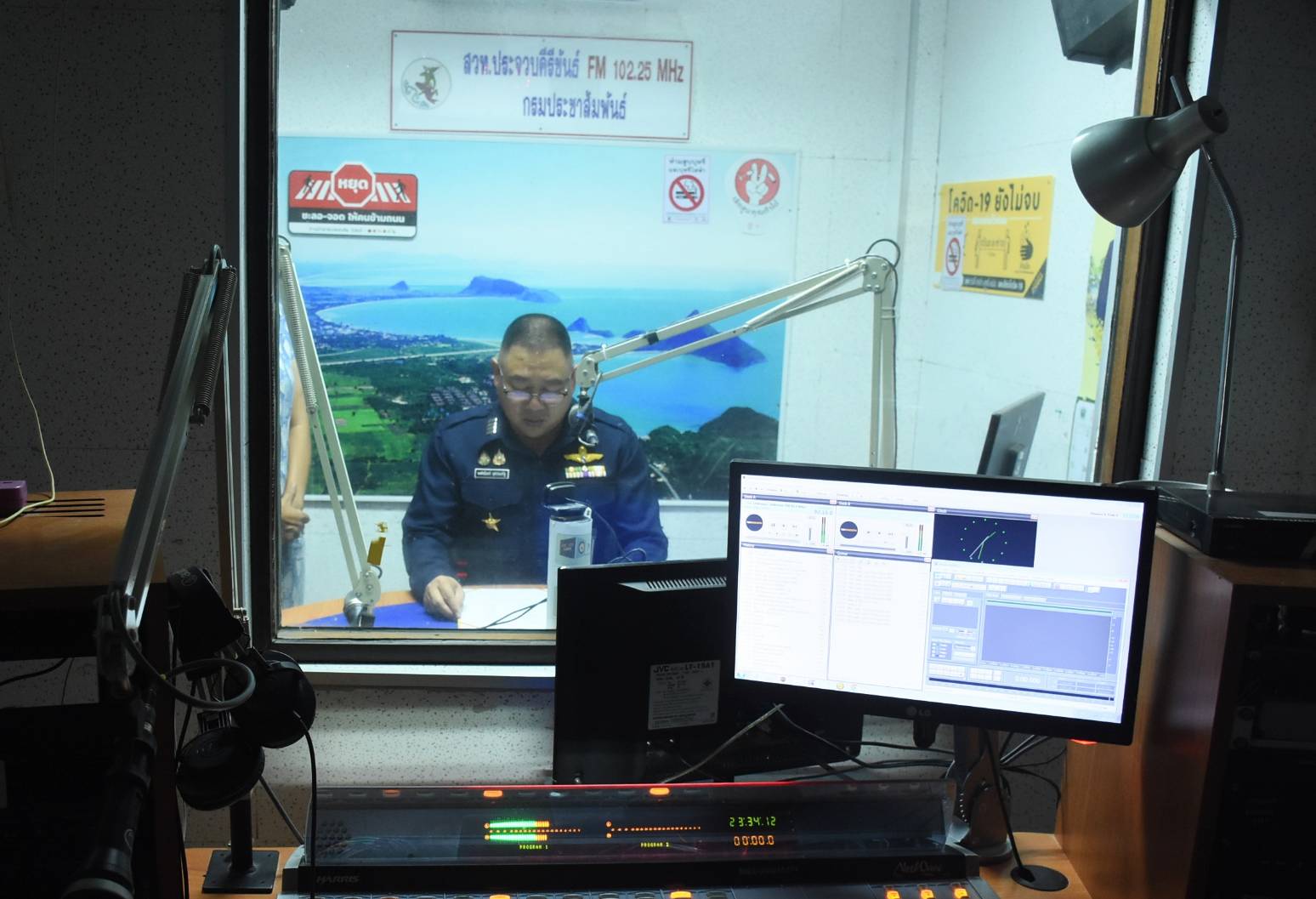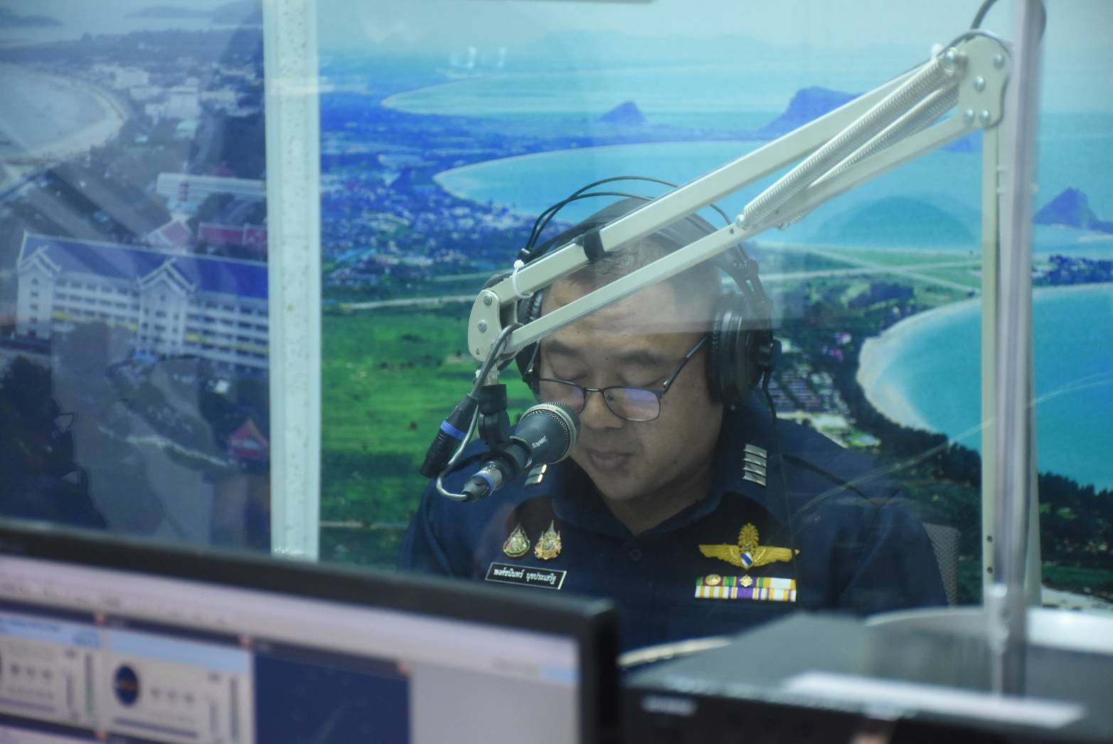 นาวาอากาศเอก พงศ์ชนินทร์ นุชประเสริฐ ผู้บังคับการกองบิน ๕ บันทึกเสียงบทอาเศียรวาทถวายพระพรชัยมงคล เนื่องในโอกาสวันเฉลิมพระชนมพรรษา พระบาทสมเด็จพระวชิรเกล้าเจ้าอยู่หัว ๒๘ กรกฎาคม ๒๕๖๘ ณ สถานีวิทยุกระจายเสียงแห่งประเทศไทยประจวบคีรีขันธ์ ตำบลเกาะหลัก อำเภอเมืองประจวบคีรีขันธ์ จังหวัดประจวบคีรีขันธ์ เมื่อวันที่ ๒๒ กรกฎาคม ๒๕๖๘